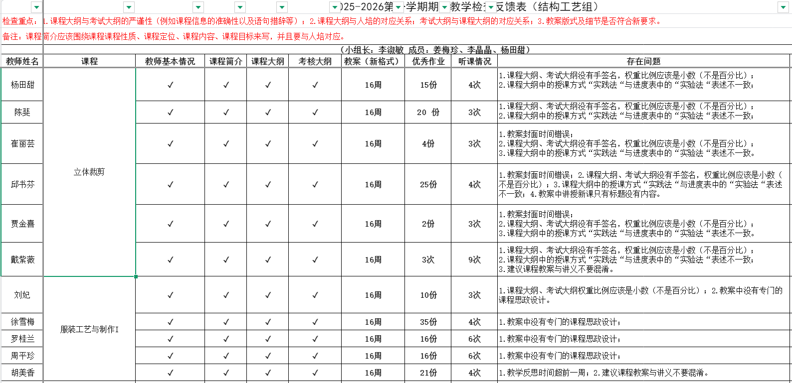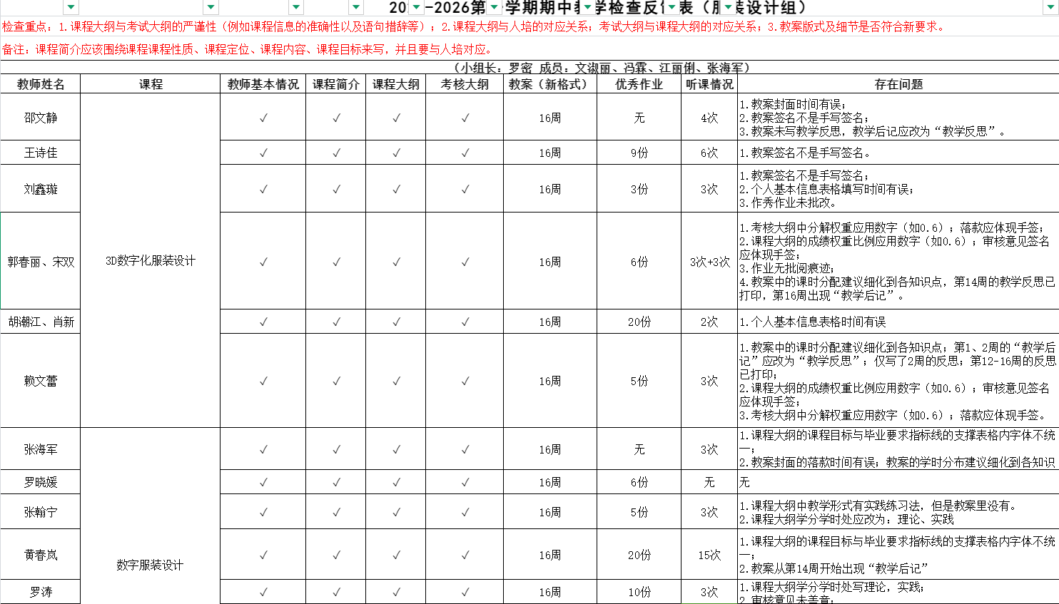 在检查过程中也发现了一些需要完善的地方:部分课程的教案中没有体现课程思政设计;个别教师的教学反思内容没有写;课程大纲、考试大纲没有签名;作业没有批改痕迹;教案封面错误等。针对这些问题,各检查小组填写《2025-2026第一学期期中教学检查情况反馈表》,并与相关教师进行充分沟通,提出具体改进建议,要求限期整改落实。