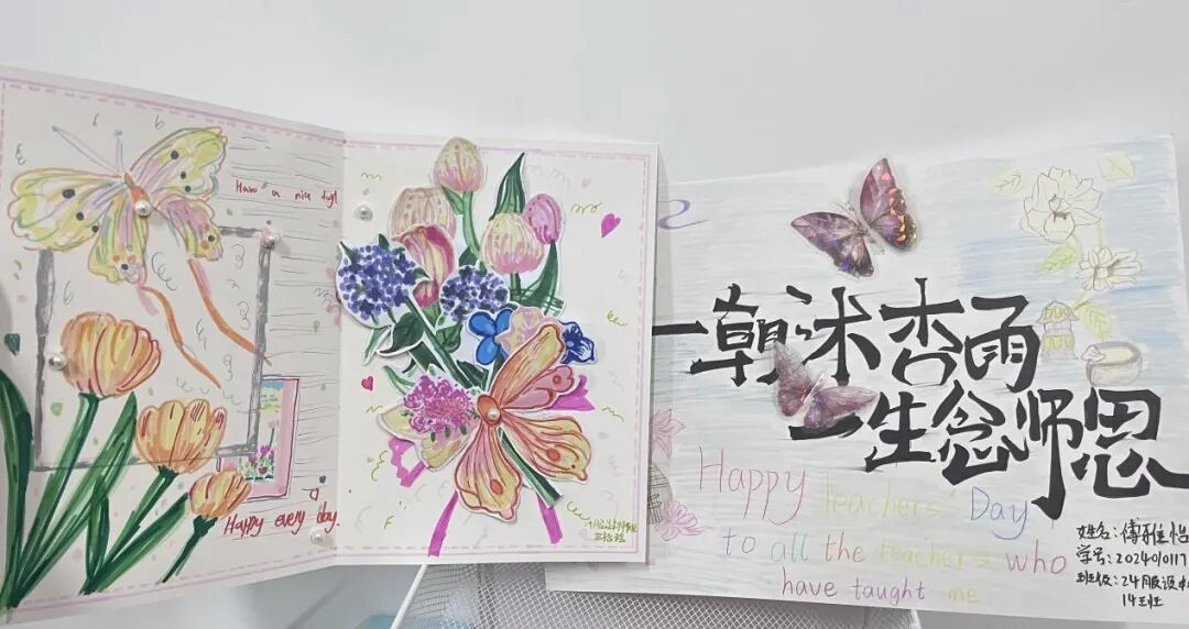立体手工贺卡组的同学们化身“折纸大师”,卡纸在手中翻折、剪裁、粘贴,不一会儿,立体的花朵、书本、小裙子便从平面中“跃”出,有的同学还在卡片内侧藏了“小心机”——写下“老师,您辛苦了!”“感谢您为我们‘织’就知识的版图”既俏皮又暖心的祝福语。