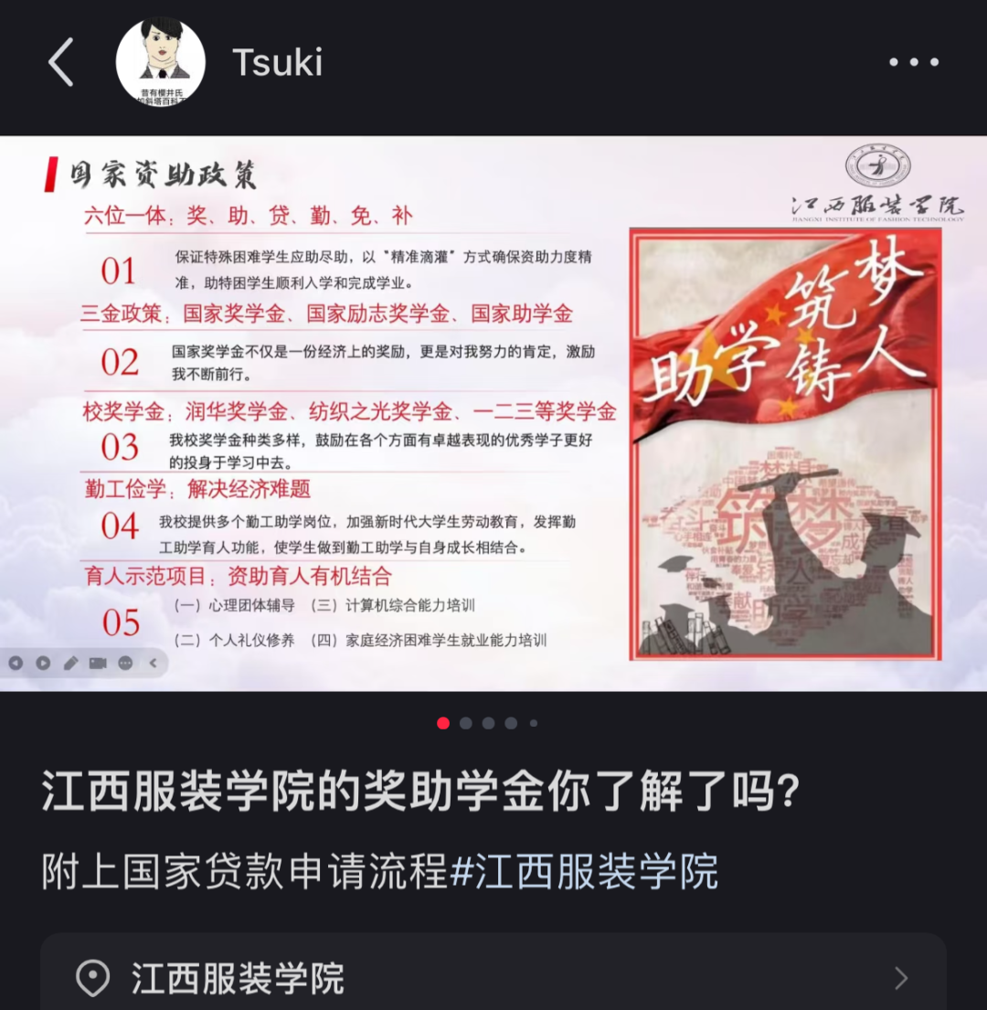 为突破地域和时间限制,让资助政策惠及更广泛人群,为了让江西服装学院的新生更加了解学校的资助政策,她通过网络,在小红书上进行更加广泛的资助政策宣传。除了讲述国家奖助学金和江西服装学院的奖学金外,她还生动解析“绿色通道”的入学流程、助学贷款的申请步骤。不仅介绍政策,更以“过来人”身份,分享如何平衡学业,以及申请各类资助奖学金的实用技巧。线上政策解答有效提升了资助政策知晓率与利用率,吴冰烨的实践彰显了当代大学生的责任担当,更探索出一条“专业赋能+新媒体助力”的资助宣传新路径,为政策落地注入青春动能活动有效提升了国家资助政策在高中生及家庭群体中的知晓率和理解度,特别是为艺术类特长生家庭注入了强心剂。