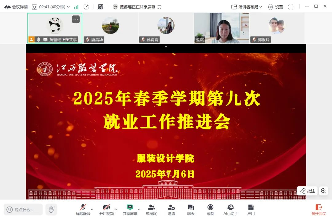 (服装设计学院通讯员:张芳)为深入贯彻落实党中央、国务院关于高校毕业生就业工作的决策部署,精准推进2025届毕业生就业服务工作,7月6日下午,服装设计学院于腾讯会议平台召开第九次2025届毕业生就业工作推进会。学院领导班子、就业联络员、全体毕业班辅导员参会,会议由学院党委书记蓝岚主持。