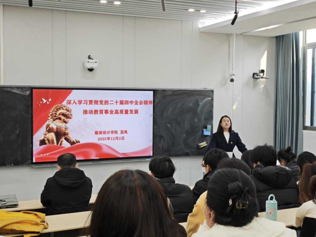 (服装设计学院通讯员:钟怡婕)为深入学习贯彻党的二十届四中全会精神,切实把思想和行动统一到党中央战略部署上来。2025年12月2日下午2时30分,服装设计学院党委于主教楼127多媒体教室召开专题学习宣讲会。学院党委书记蓝岚以《深入学习贯彻党的二十届四中全会精神 推动教育事业高质量发展》为题作宣讲报告,通过系统解读全会精神,全院师生党员、骨干教师代表参会,凝聚起以全会精神引领教育事业高质量发展的思想共识。