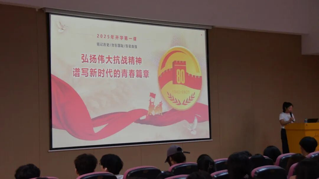 (服装设计学院通讯员:高亮财)为深入学习贯彻党的二十届三中全会精神和习近平总书记重要讲话精神,落实省教育厅关于思想政治教育的工作要求,引导学生铭记历史、缅怀先烈、弘扬伟大抗战精神。9月19日晚,服装设计学院党委书记蓝岚在艺术楼南六报告厅以“弘扬伟大抗战精神,谱写新时代的青春篇章”为主题,为2025级本科新生讲授第一堂思政课。