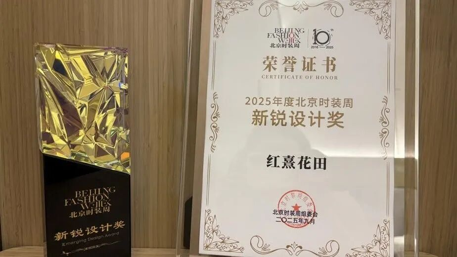 (服装设计学院通讯员:钟怡婕)2025年9月26日,SS2026北京时装周时尚盛典暨尚仄国际“紫禁城”时尚之夜颁奖典礼在京举行,来自我校纺织服装现代产业学院的大学生创业品牌“红熹花田”的年轻设计师团队脱颖而出,荣获“新锐设计奖”大奖,指导教师赵艺婷代表团队上台领奖。