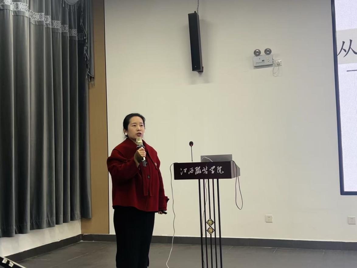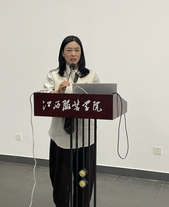 核心分享环节精彩纷呈,文淑丽博士以《跨越光谱与文明的色彩双重奏》为主题,围绕英国剑桥大学资深研究员斯派克・巴克洛的《红色:色彩的艺术与科学》展开深度分享。文淑丽博士从书籍概况、内容结构、跨学科视角、学术价值等多个维度,系统解析了红色的科学属性与文化艺术表达的内在关联,梳理了红色从天然颜料提取到人工合成的技术演进史,剖析了其在自然现象、文化符号、艺术史与现代设计中的多重内涵。她还结合江西地域文化特色,挖掘了瓷都祭红、龙虎山丹霞红、客家剪纸大红等本土色彩艺术的独特魅力,并将书中理念与尚钢校长《江服之美随想曲》相呼应,探讨了色彩美学在服装设计教学中的实践路径,为在场教师解锁了服饰色彩教学的新方法、新思路,其跨学科的研究视角和贴合本土的教学思考赢得阵阵掌声。
