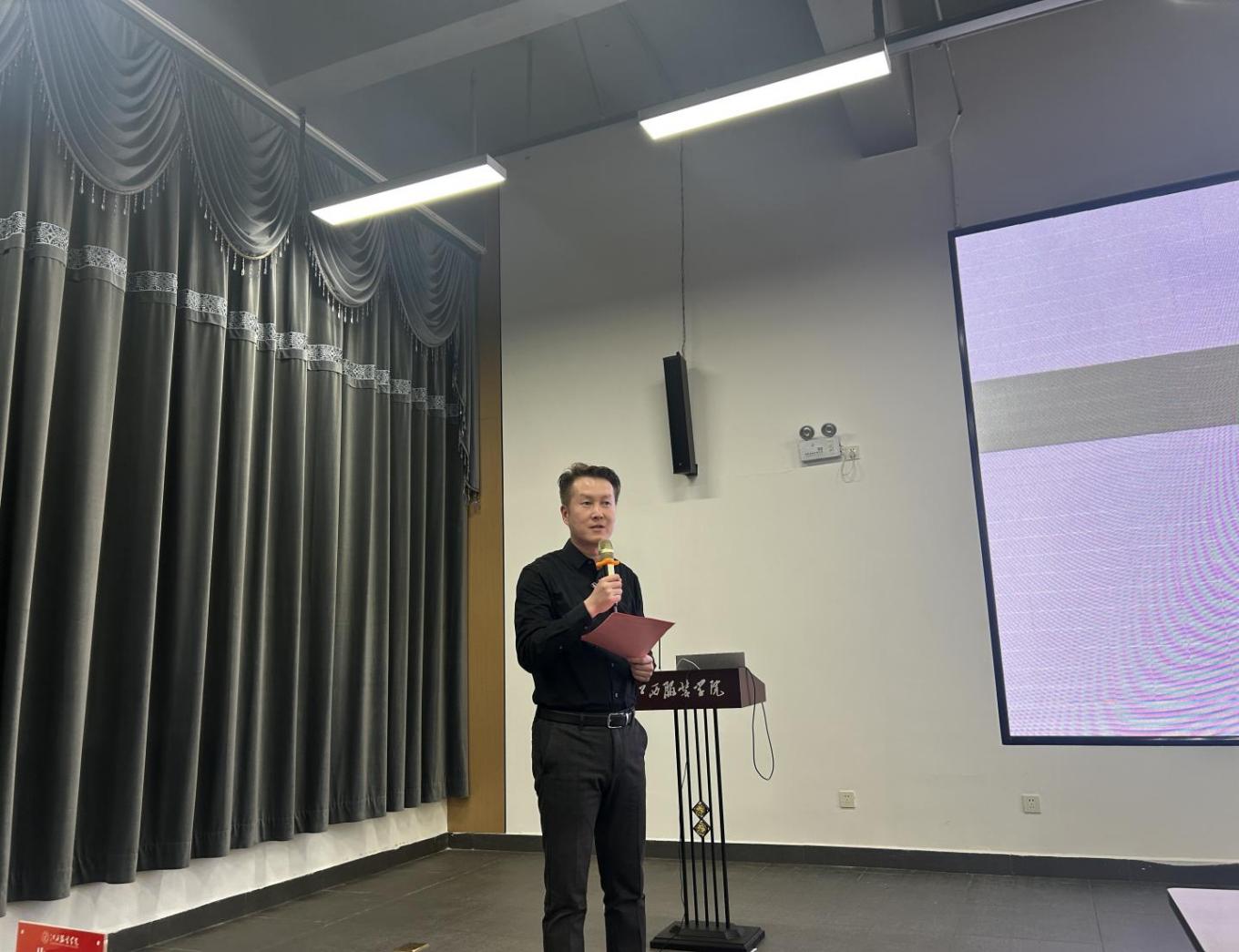 分享会伊始,主持人张宁院长发表热情洋溢的致辞,向莅临现场的尚钢校长及全体参会教师表示热烈欢迎和衷心感谢。他详细阐释了“锦绣文心”的深刻内涵:“锦绣”承载着中华传统服饰的千年匠心,是一针一线的工艺美学,更是服装设计的本源载体;“文心”蕴含着以书润心、以文化人的教育初心,是通过阅读沉淀底蕴、以文化赋能设计的精神内核。张宁院长表示,本次分享会紧扣服饰色彩美学、传统服饰文化传承与教研创新两大核心,旨在以书籍为纽带,让经典著作照亮教学之路,让文化底蕴滋养设计初心,助力全体教师碰撞思想火花、凝聚教研共识。