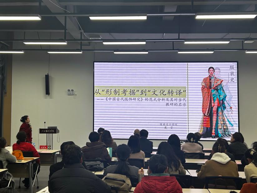 随后,戴莹副教授以《从“形制考据”到“文化转译”》为主题,围绕沈从文编著的经典著作《中国古代服饰研究》展开分享。戴莹副教授从经典奠基、范式分析、科研启示、教学启示四个维度,深入解读了这部著作的学术价值与教研意义。她指出,沈从文先生以实物为核心、以多源证据互证为方法,将服饰研究从零散的文献记载推向独立的实证研究领域,构建了“形制—演变—制度—文化”的四层研究结构,为服饰史研究奠定了坚实基础。结合当代服饰研究现状,她分享了该著作对科研的启示:推动传统服饰研究从形制描述走向文化意义分析,从单一学科走向跨学科融合;同时针对服装设计教学,提出了课程建设向研究型转型、教学内容按文化逻辑重构、借助数智技术打造沉浸式教学场景等具体建议,为传统服饰文化融入现代课堂提供了宝贵的教研思路,让在场教师受益匪浅。