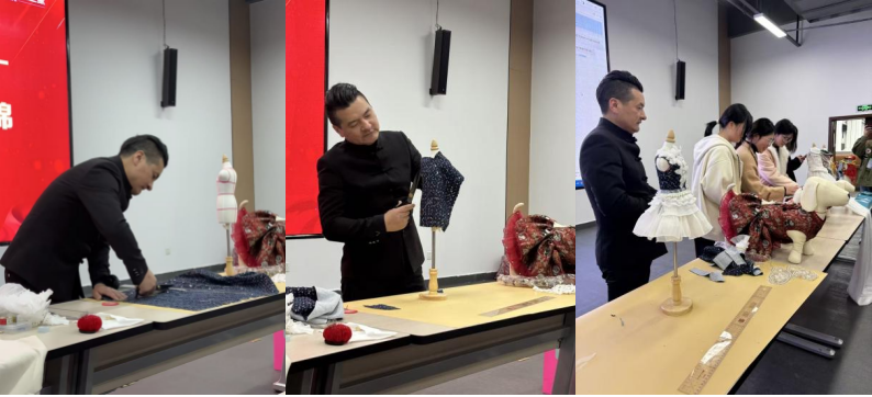 理论分享后,活动进入最受期待的环节——立体宠物服装现场教学。吴海平老师带来了宠物服装面料和人台模型,亲自演示立体裁剪的全过程。他从量体、画线开始,逐步讲解如何根据宠物身形进行版型调整,如何选择适合的面料和辅料,并特别强调了宠物服装的舒适性和安全性。“宠物不会说话,设计师必须通过结构设计让宠物活动自如,同时避免任何可能造成伤害的细节。”吴老师一边操作一边解说,手中的布料随着裁剪和别针逐渐成型,一件精美的宠物礼服呈现在大家眼前。完成制作后,吴海平老师邀请现场学生上台近距离参观交流。同学们围绕在作品周围,仔细观察服装的结构细节和装饰工艺,并就面料特性、裁剪技巧等问题与吴老师展开热烈交流。