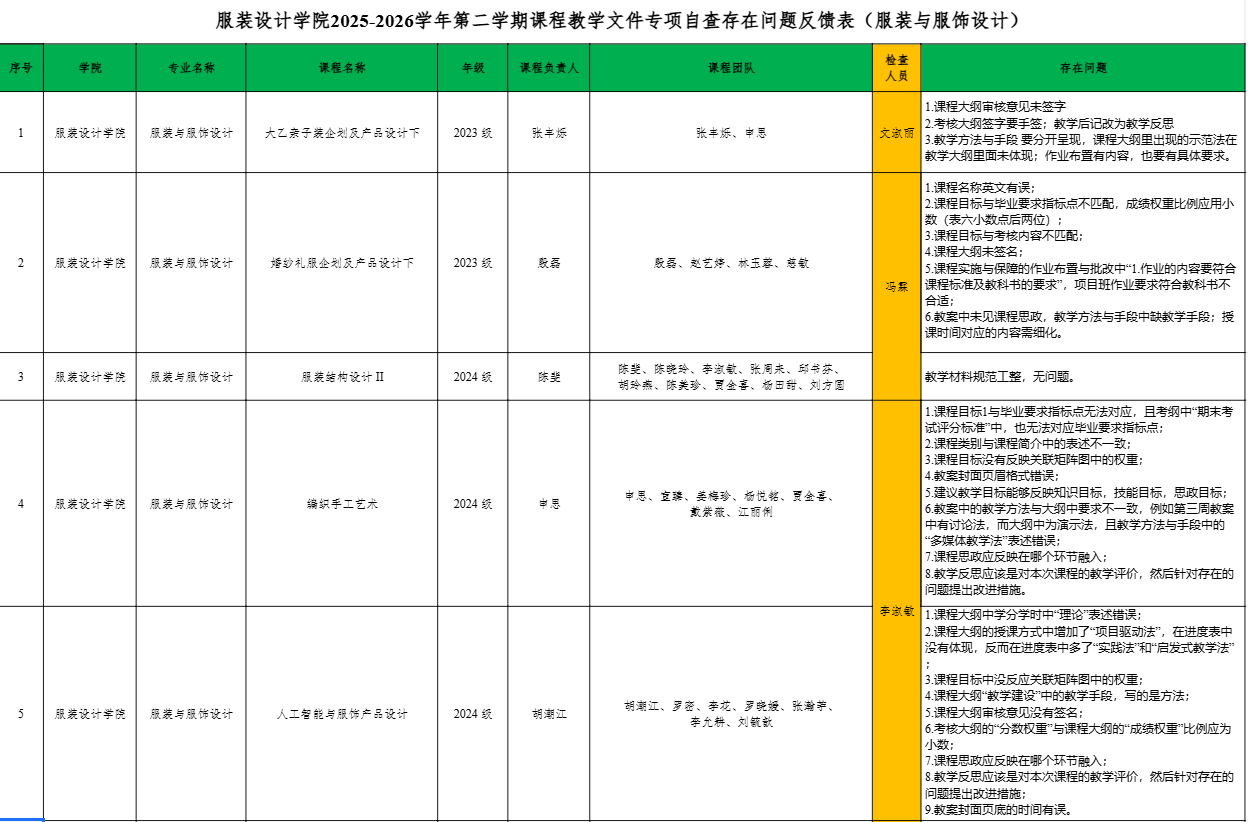 (服装设计学院讯通讯员:王慧)为进一步规范教学运行管理,强化教学质量监控,落实立德树人根本任务,切实提升课程教学标准化、规范化水平,服装设计学院于2026年3月30日13:00始,在主教学楼104会议室组织开展了2025-2026学年第二学期课程教学文件的专项检查工作。本次检查由学院督导李淑敏、付洁、黄春岚、冯霖及专业负责人文淑丽、徐淑波6人共同参与,重点对本学期开设本科的课程大纲和教案进行细致自查。通过此次系统性的专项自查,学院将进一步完善教学质量监控体系,持续推进教学文件标准化建设,为全面提升教育教学质量、夯实人才培养工作根基筑牢坚实保障。
