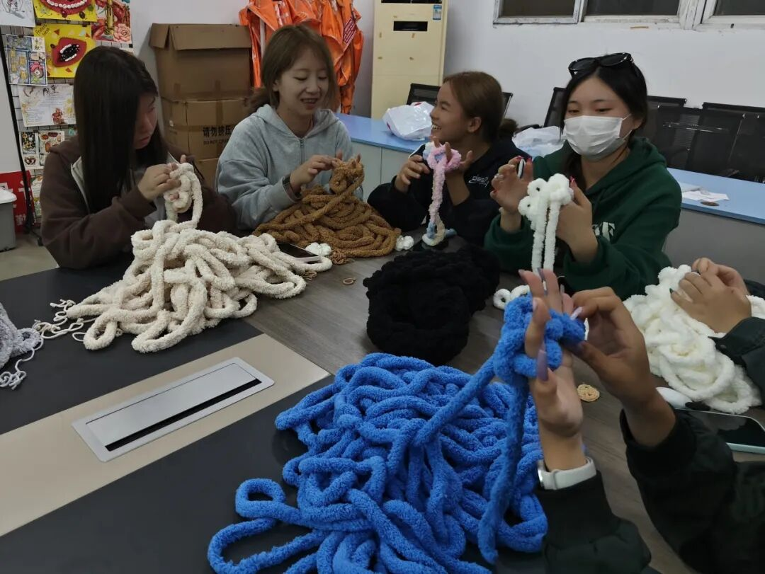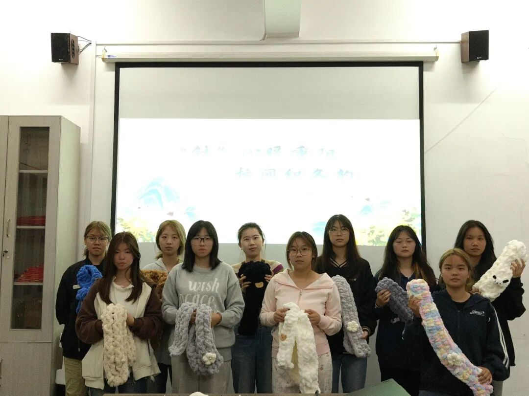 随着时间推移,一件件饱含心意的编织成品逐渐完成。活动最后,成员们手持自己编织的围巾作品集体展示,色彩鲜艳的织物与大家的笑容相映成趣,现场还组织了合影留念,定格下这份充满温情的瞬间。社团活动负责人表示,将尽快整理好所有成品并寄往山区,希望孩子们能在寒冬来临前收到这份来自江西服装学院的温暖祝福。