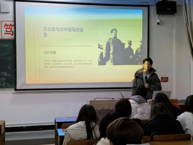 分享会上,学院青马班优秀学员代表率先登台,结合自身阅读感悟与专业学习经历,分享对经典著作的独特理解。有的学员聚焦作品中“对美好未来的憧憬”,畅谈如何将方志敏同志的理想信念转化为专业学习的动力,在服装设计中融入中国元素、传递民族精神;有的学员提炼书中“坚韧不拔、精益求精”的精神特质,反思专业学习中的浮躁心态,倡议以“工匠精神”打磨专业技能;还有的学员从“可爱中国”的新时代内涵出发,探讨设计学科学生如何通过创意作品讲好中国故事、助力文化传承。真挚的分享引发全场共鸣,让红色经典与设计专业特色碰撞出别样火花。