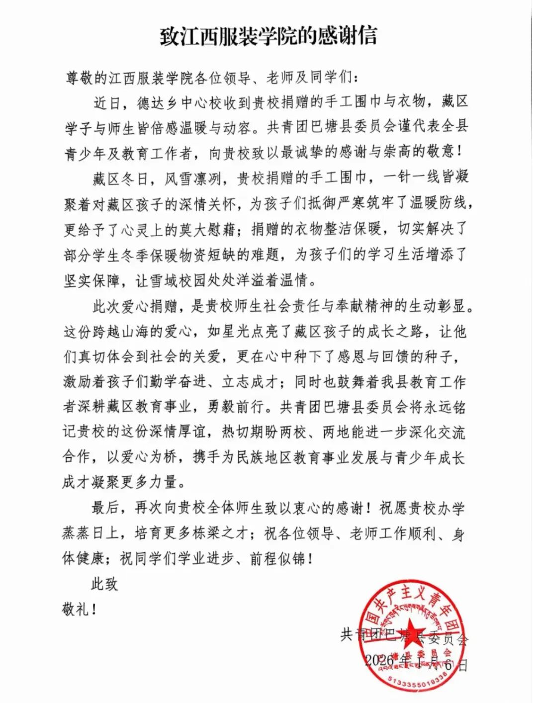 (服装设计学院通讯员:钟怡婕)凛冬虽寒,大爱无疆。近日,江西服装学院服装设计学院发起的“情暖高原 爱心续航”衣旧情深爱心募捐活动,随着满载全校师生深情厚谊的爱心包裹抵达四川甘孜藏族自治州巴塘县德达乡中心校,圆满完成了跨越千里的温暖传递。这份凝聚着江服人社会责任与公益情怀的爱心馈赠,不仅为高原山区的孩子们送去了抵御严寒的暖心物资,更收获了来自藏区师生的真挚回响,让爱心在山海之间双向奔赴。