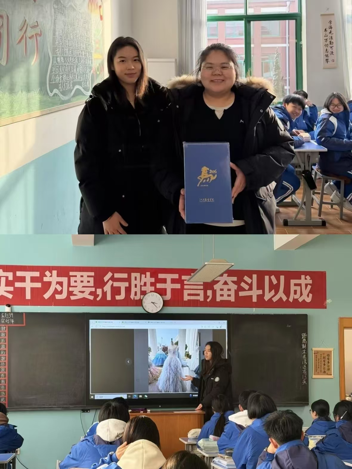 (服装设计学院通讯员:钟怡婕)凛冬时节,朔风送怀,一众江服学子怀揣着殷殷感念,重返阔别已久的高中母校。推门而入,熟悉的校园虽裹着冬日的清寒,却因琅琅书声、恩师笑颜漾着融融暖意,操场的晨光、教室的窗影,瞬间勾连起曾为梦想挑灯苦读的青葱岁月。从高中校园的蓄势积淀,到江服校园的专业深耕,数载光阴流转,不变的是母校教诲的初心,难忘的是恩师引路的温情。此次冬日返校,既是一场与青春的重逢,更是一次带着大学成长与专业感悟的感恩回望,学子们于冬日校园里重温初心、交流心得,也愿以自身的求学经历,为学弟学妹们捎去一份冬日里的前行力量,延续与母校的温暖联结。