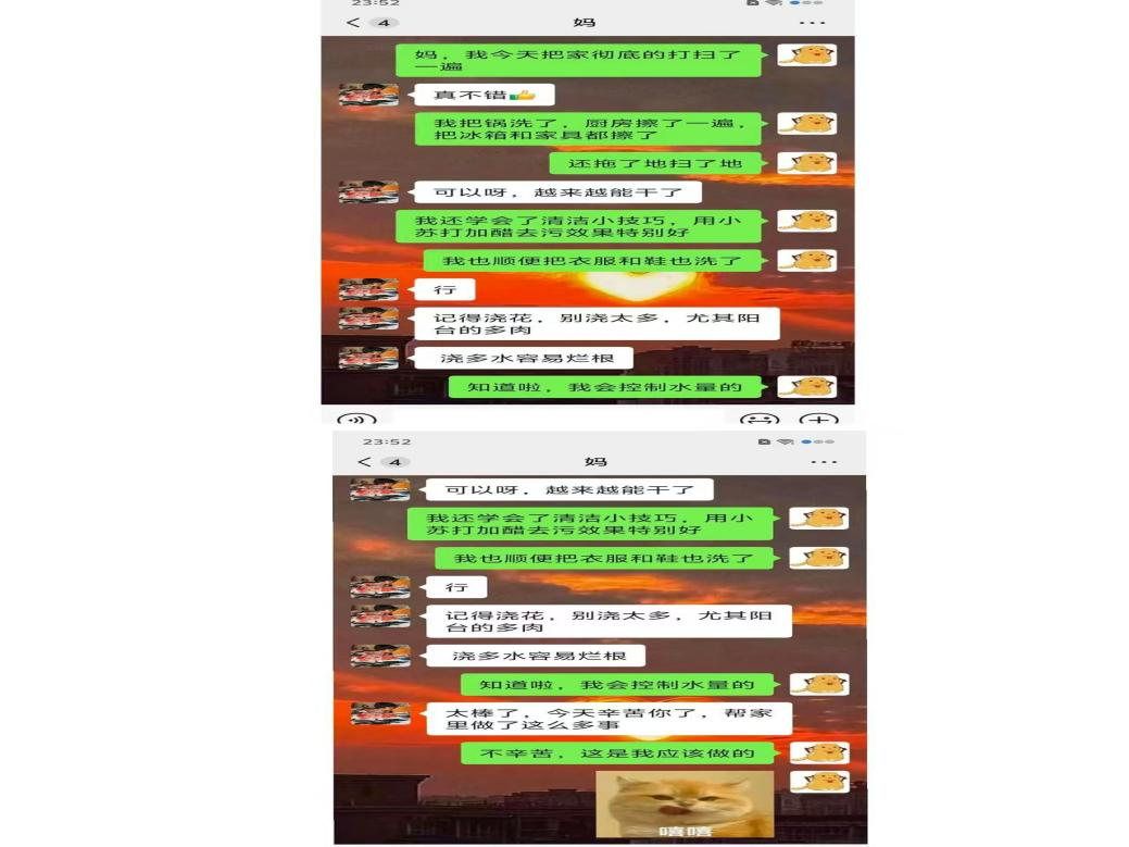 原以为家务不过是简单重复,真正动手才发现,每一件小事里都藏着耐心与用心。顽固的油污、角落的灰尘、需要细致整理的冰箱,都要沉下心一点点做好。当杂乱归于整洁、油腻变得清爽时,我真切体会到,把小事做到极致,本身就是一种成长。