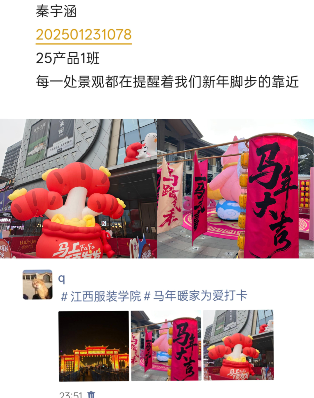走上街头,巨大的充气“马上发发”、迎风招展的“马年大吉”旌旗,还有流光溢彩的新春门楼,都在诉说着新年的喜悦。作为服装设计专业的学生,我也在这些色彩与造型中,汲取着新的设计灵感。