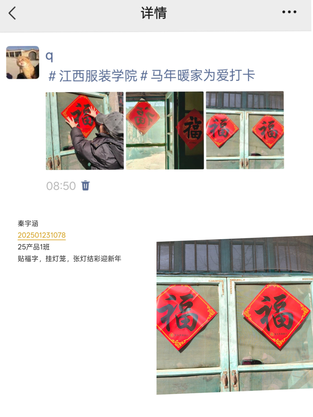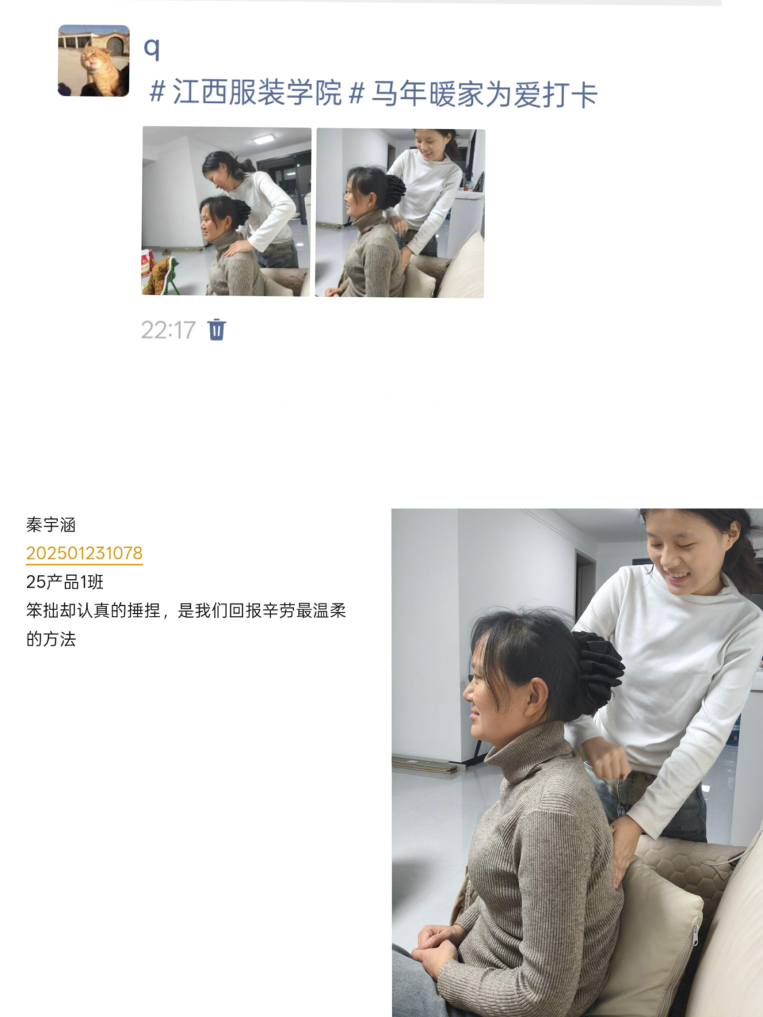 这个寒假,七天打卡,不仅是一次劳动实践,更是一场关于爱与成长的修行。作为服装设计学院的学子,我们不仅用剪刀和针线塑造美,更用双手和真心,在生活中创造着温暖与感动。
