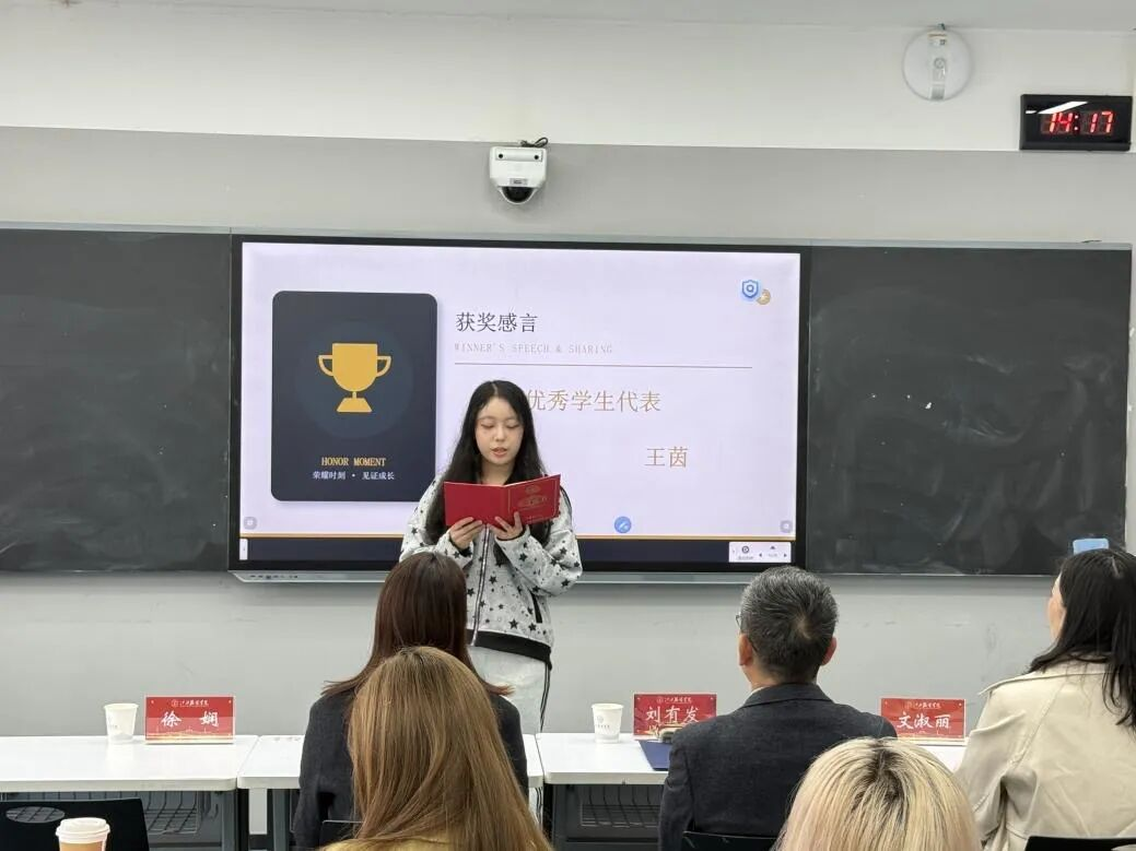 在随后的颁奖环节中,依次颁发了“寒假英语学习坚持之星奖”“英语精听进步奖”“创意思维导图奖”以及“优秀学生奖”等多个奖项。刘子瑜、胡锦虔、郭初宁、王茵、吴玥僮、王子蕊、田芯蕊、周弋茜、张誉馨、梅鹤镪、钱许诺等同学凭借扎实的学习态度和突出的学业表现赢得了师生们的热烈掌声。其中,获得“优秀学生奖”的王茵同学作为代表上台发言。她全程用英文分享了自己在英语学习中的点滴经验与成长感悟,表达了对学校、老师和同学们的感谢。她流利的口语和自信的表达赢得了全场热烈的掌声。