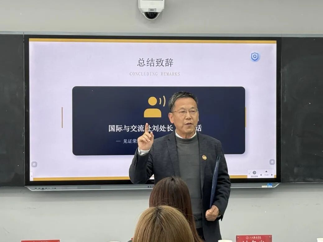 颁奖仪式结束后,国际交流与合作处处长刘有发首先讲话。他以流利的英文向师生问好,鼓励大家以语言为桥走向世界;接着用中文谈到,国家“十五五”规划对教育国际化提出了更高要求,学校正积极响应,着力培养具有全球视野的时尚人才。他勉励同学们珍惜中外合作办学平台,将英语学习与专业发展紧密结合,为未来走向世界打下坚实基础。