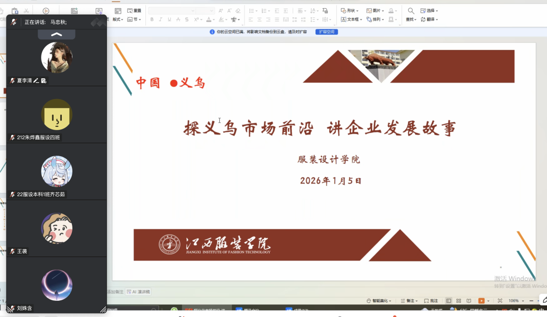 (服装设计学院通讯员:钟怡婕)为助力已斩获义乌企业录用通知的毕业生更好适配职场环境、科学规划职业发展,1月5日晚,服装设计学院党委副书记马忠秋以线上宣讲形式,开展“探义乌市场前沿,讲企业发展故事”主题访企拓岗心得分享会,为即将踏上职业征程的学子们送上“职场导航指南”。