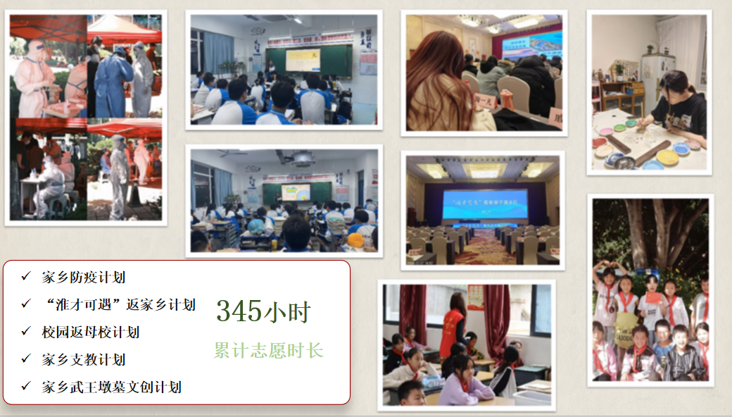 她始终怀揣对志愿服务的热忱,自2022年以来积极投身疫情监测、返家乡、返母校等各类公益实践。疫情防控期间,她主动坚守社区监测一线,细致完成体温测量、人员信息登记及防疫政策宣讲等工作,以耐心与坚守筑牢基层防疫屏障;假期返家乡时,她扎根故土深入基层,开展敬老助老、政策科普、便民服务等活动,用贴心举措回馈家乡养育之恩;重返母校期间,她化身新生引路人,参与校园迎新、公益督导等志愿工作,以自身经验传递温暖与正能量。截至目前,她累计志愿时长达345小时,踏实的作风与负责的态度赢得了服务对象及组织方的广泛认可,先后获得返母校志愿活动“优秀志愿者”、返家乡志愿行动“先进个人”称号,用实际行动生动诠释了当代青年的社会责任与担当。