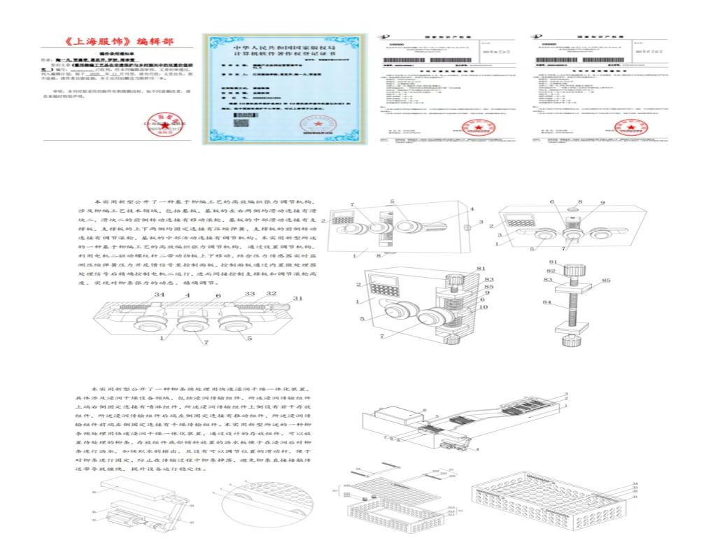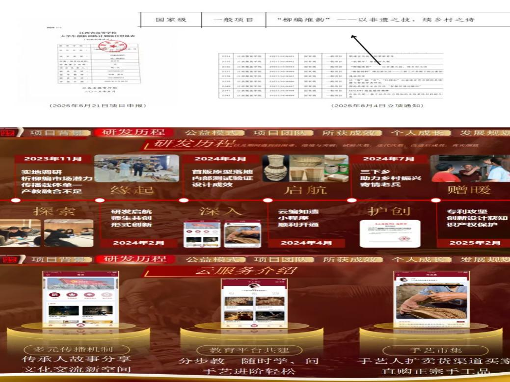 针对传统柳编“效率低、损耗高、标准化不足”的核心问题,她带领团队研发出“基于柳编工艺的高效编织张力调节机构”“柳条预处理用快速浸润干燥一体化装置”两项实用新型专利,经当地作坊试用,让柳编生产效率提升20%以上,原料损耗率减少15%,获当地农民认可;同步完成软件著作权登记,为地方柳编企业提供数字化管理参考,还在行业期刊发表相关研究论文,梳理技术应用经验。项目“淮韵柳编”获得了三创赛、新文科等双创奖项。通过校企合作推广技术与标准化生产流程,形成“研发 - 应用 - 升级”的闭环,为非遗产业规模化发展提供可复制的技术方案。