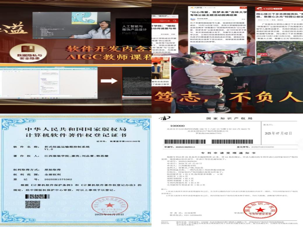 作为深耕双创领域的实践者,她主动投身国家级科研项目研究,以AI技术为创新引擎,研发AI绘本软件,将服装设计思维与数字技术深度融合,探索出“科技+设计”的新型创作路径,让设计过程更高效、设计呈现更多元。凭借扎实的科研能力与创新实践,她成功获得1项软件著作权、1项实用新型专利,并将研究成果梳理总结,撰写发表学术论文1篇,用实际行动践行新时代大学生“以研促学、以创践学”的专业素养。