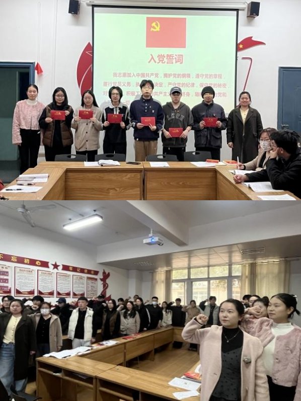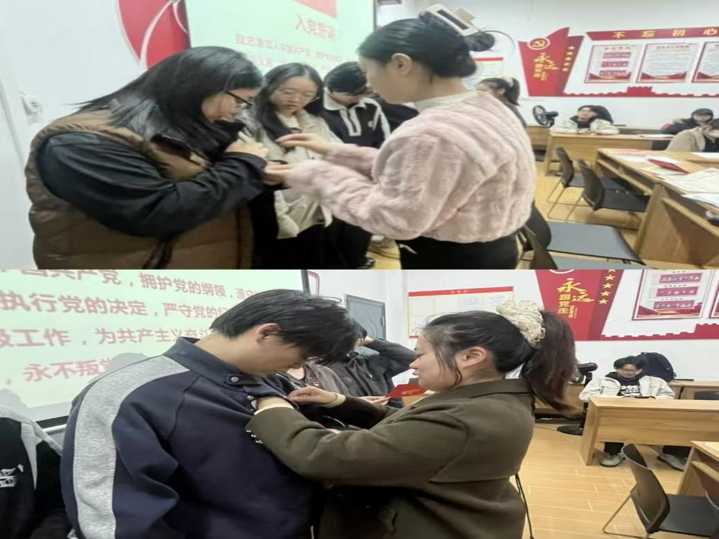 活动第三项,由党支部委员陈姝、黄睿瑶为本月过“政治生日”的同志赠送生日贺卡,佩戴党员徽章,全体党员重温入党誓词。