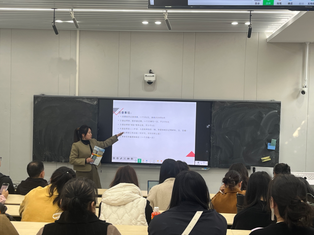 会上,学院就业联络员黄睿瑶老师首先对“一生一册”帮扶手册的填写规范、内容要素及更新要求进行了系统讲解和现场示范。她明确提出,第一帮扶人需与重点关注群体毕业生建立“一对一”结对帮扶关系,精准掌握每一位学生的家庭情况、就业意愿、职业规划及现实困难,至少开展5次深度谈心谈话,及时疏导就业焦虑、传递就业政策;为有就业意愿的毕业生精准推荐5个以上匹配度高的有效岗位,拓宽就业渠道;组织参与5次以上线上线下就业促进活动,提升求职能力,所有帮扶过程需详细记录、动态更新,确保帮扶工作可追溯、可核查。
