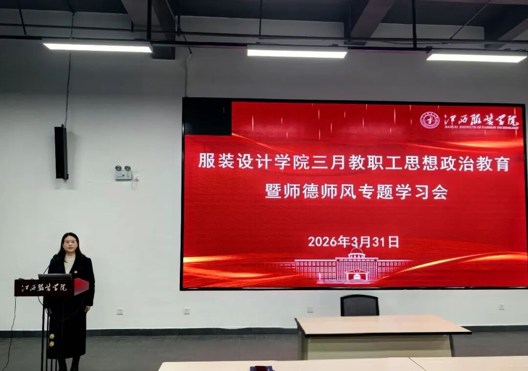图1服装设计学院三月教职工思政与师德师风专题学习会现场,蓝岚书记主持