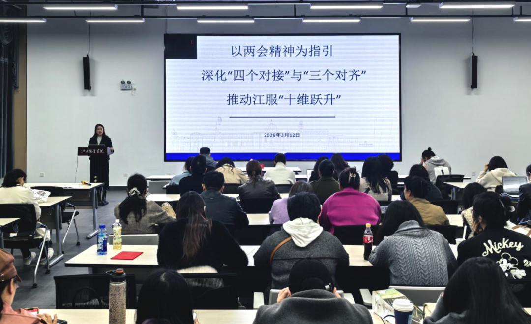 随后,蓝岚向全体教职工宣讲解读涂燕萍理事长关于深化“四个对接”“三个对齐”推动江服“十维跃升”的重要思想。讲解结合2026年全国两会精神与学校发展实际,从时代背景、核心内涵、实践要求三个维度,深入阐释“四个对接”的战略定位、“三个对齐”的评价标尺和“十维跃升”的具体行动路径,明确这一重要思想是学校办学治校、提质发展的行动纲领,也是教职工践行正确政绩观、推动工作开展的重要遵循。