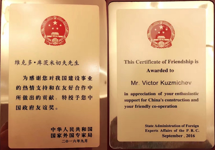 图6“中国政府友谊奖”证书