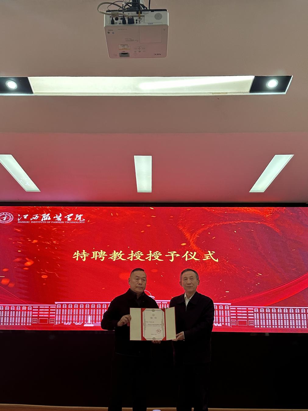 活动伊始,在全体与会师生的见证下,校领导尚教授代表学校为叶洪光教授隆重颁发江西服装学院特聘教授聘书。此次聘任不仅是学校推进纺织非遗学科建设、强化高端人才引育的重要举措,更是双方共同致力于中华优秀传统文化传承创新的崭新起点。
