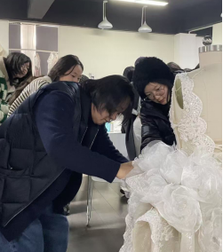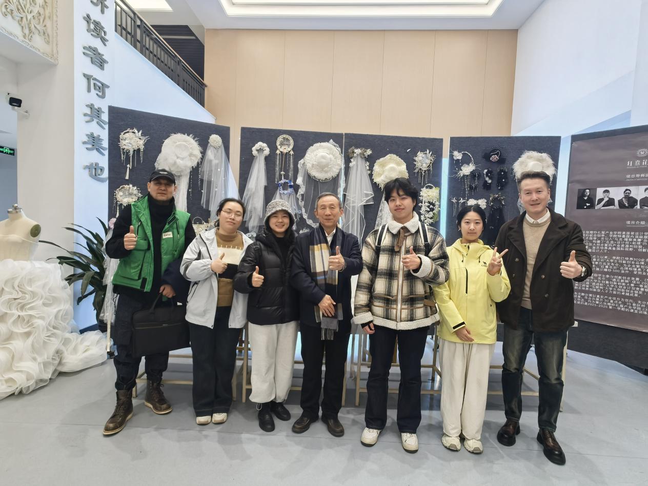(服装设计学院讯 通讯员:赵艺婷)为展现婚纱礼服项目教学成果,深化产教融合协同育人实践,彰显学科特色与办学优势,2025年12月17日~19日,服装设计学院在主教楼一楼大厅举办 2025“红熹花田”婚纱礼服静态艺术作品展。展览期间设计学院院长张宁陪同校领导尚教授前往